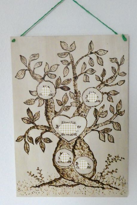 Dieser Stammbaum ist auf eine Holzplatte (ca. 21x30x0,5 cm) von Hand gebrannt.