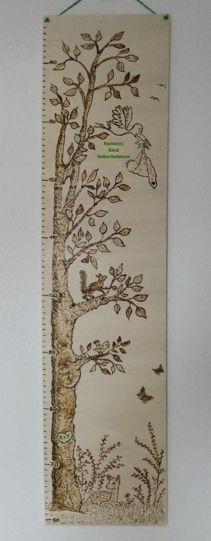 Der wunderschöne, liebevoll von Hand gebrannte Baum hat eine Höhe von 110 cm. Der Maßbaum wird 60cm über dem Fußboden aufgehängt, so dass die Größe des Kindes von 60cm bis 150cm eingetragen werden kann.