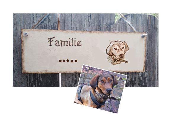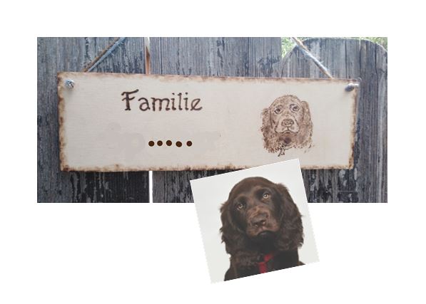 In Handarbeit gebranntes Türschild mit Hundeportrait (nach Foto).