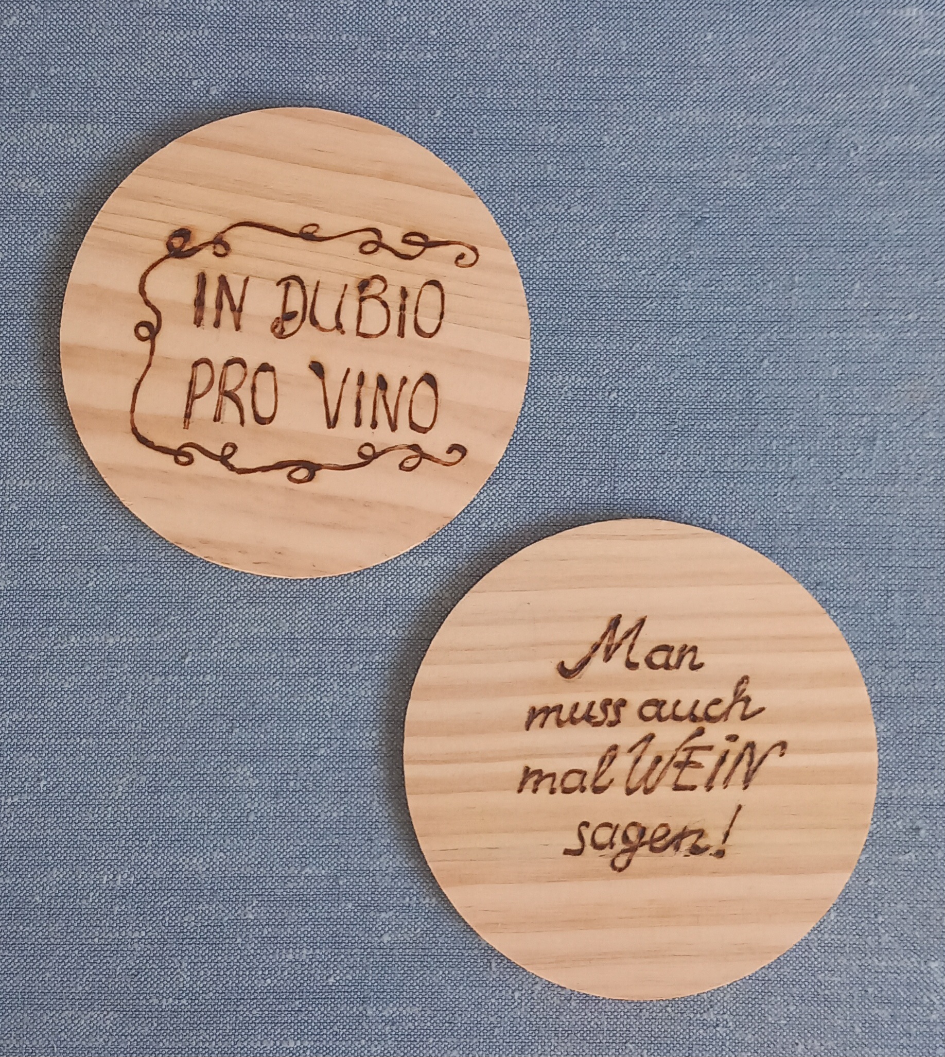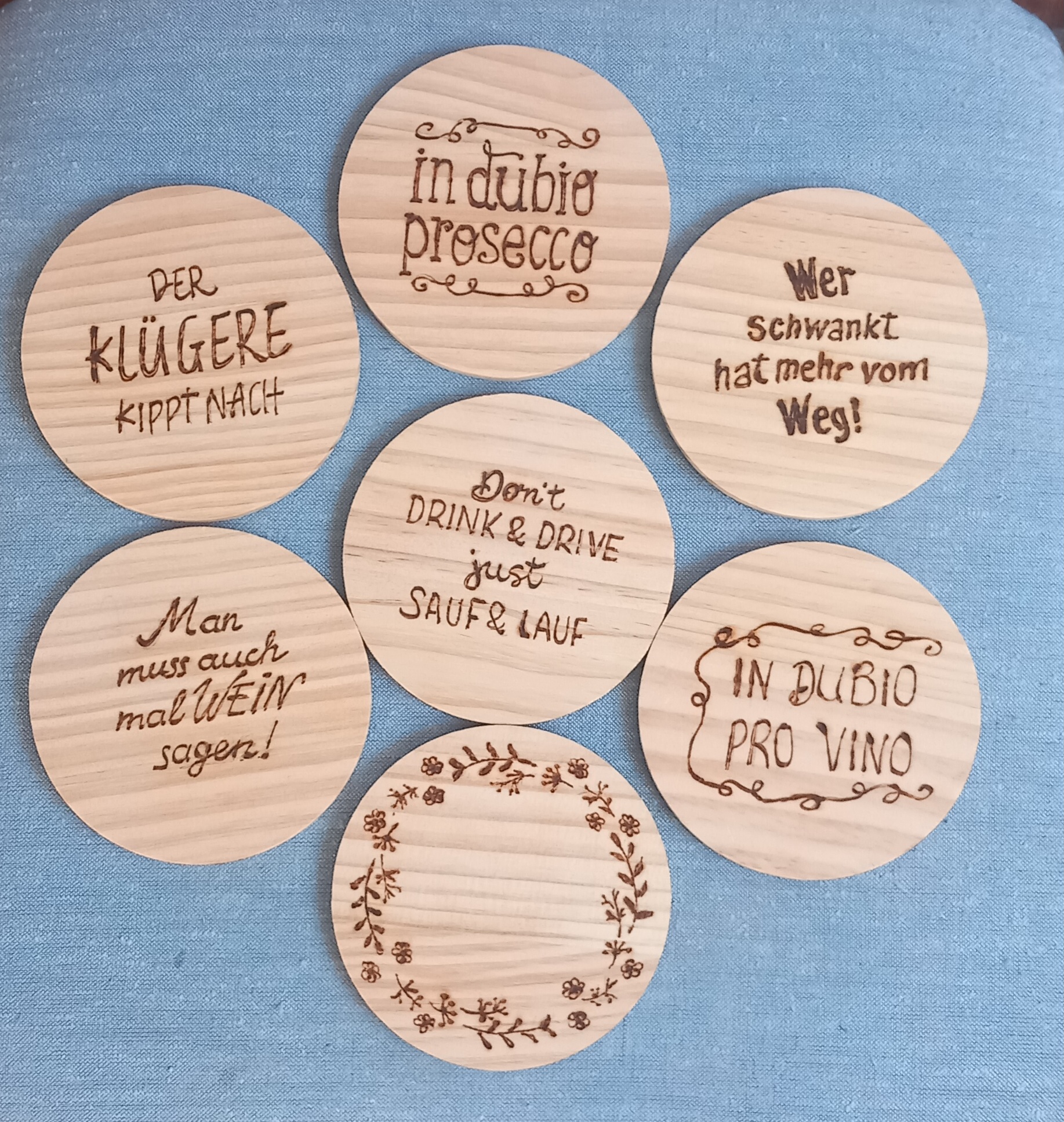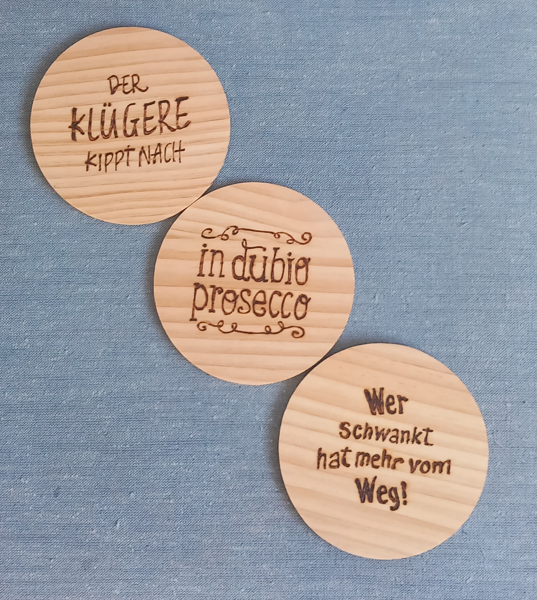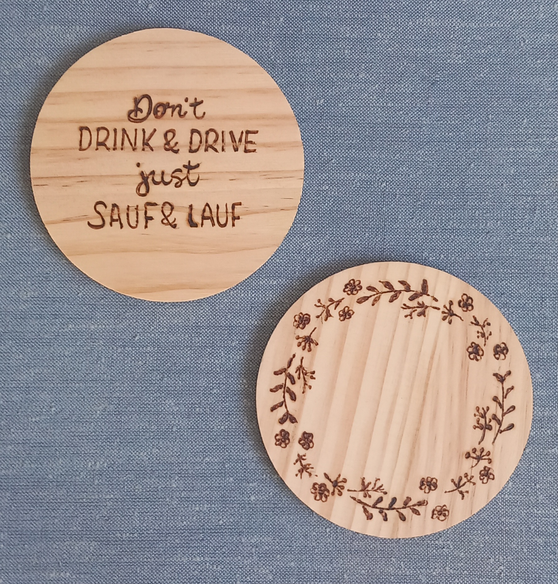 Die runden Untersetzer aus Holz sind liebevoll von Hand gebrannt, jeder ein Unikat.